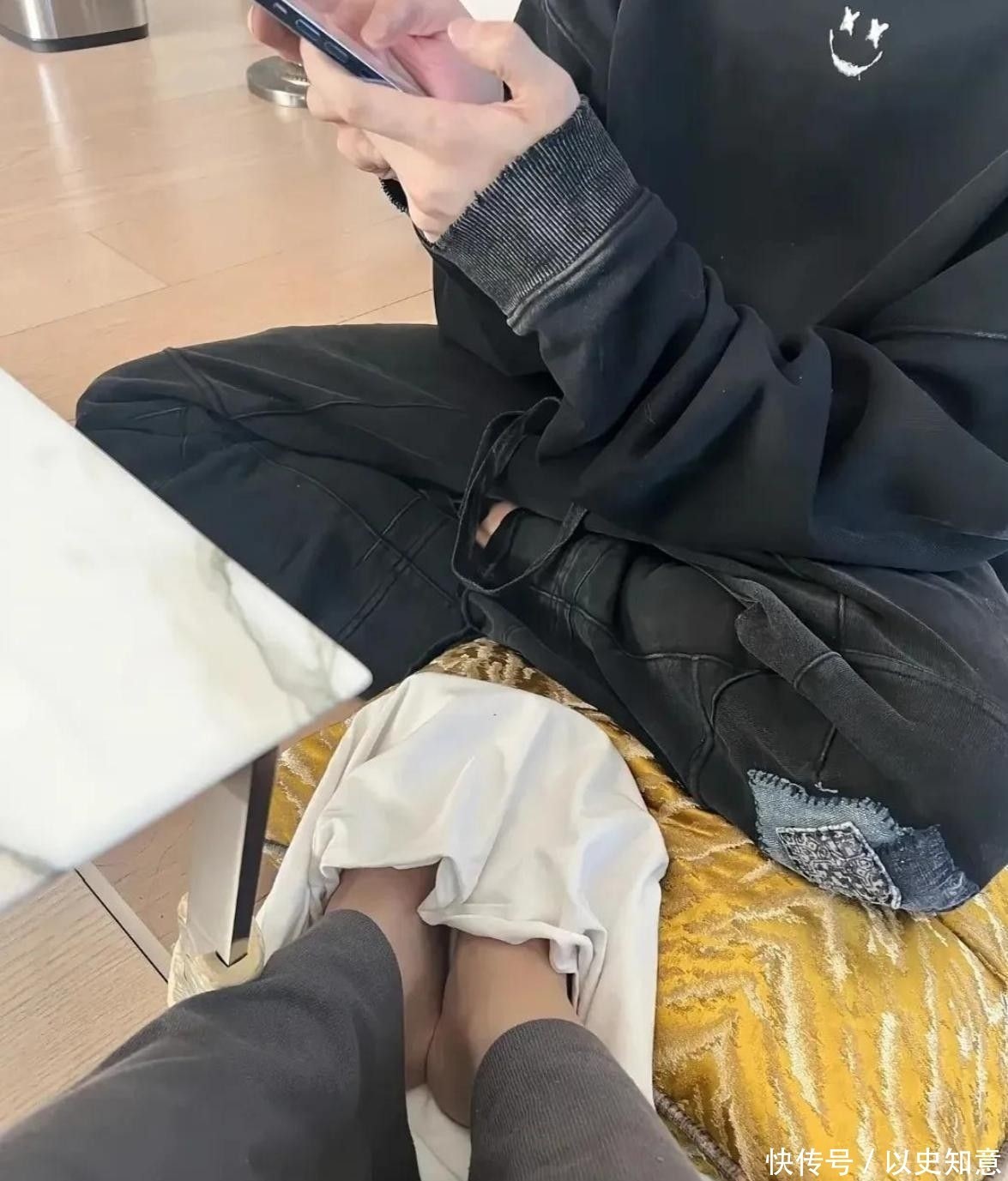 除了床照,司晓迪还发了一张男子给她捂脚的照片,虽然没露脸,但是网友们发现,男子穿的卫衣,和关晓年在社交平台分享的穿搭是同一款。