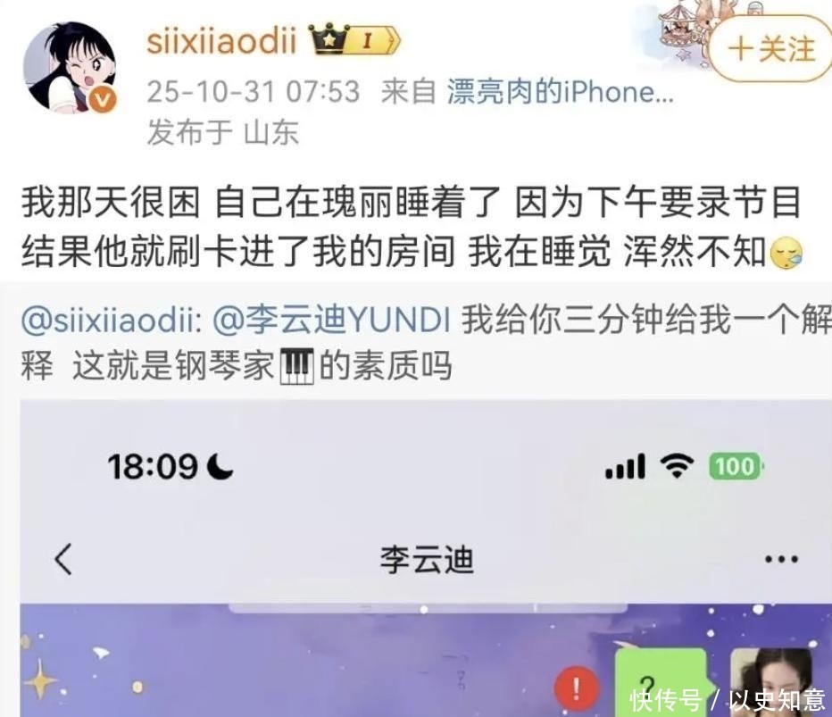 除此之外,2025日晚,司晓迪还曾通过微博实名指控钢琴家李云迪,说对方在酒店趁她服药入睡后实施不当行为,之后还把她拉黑了。